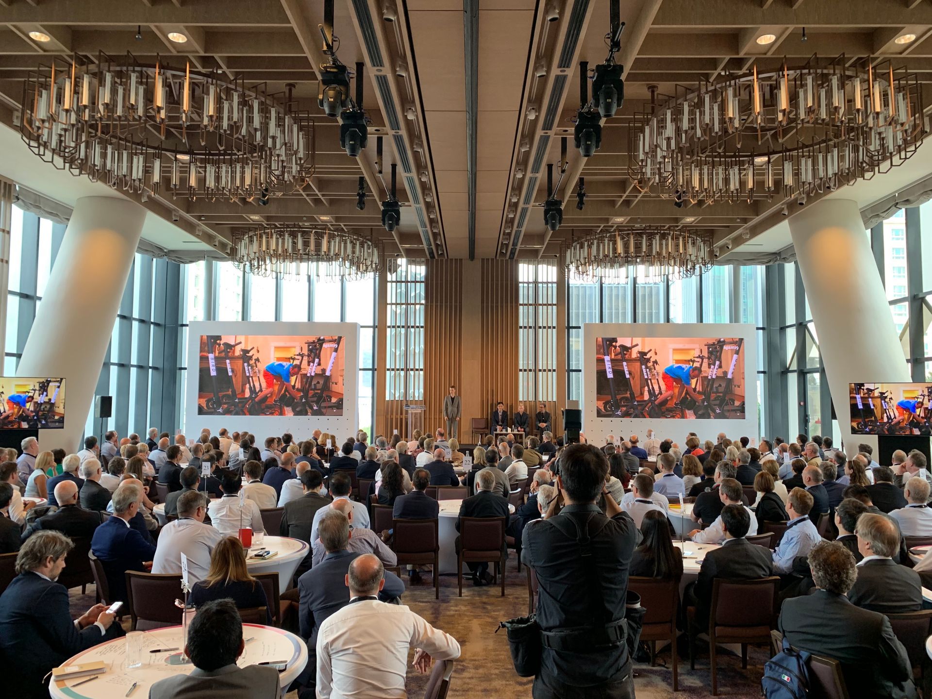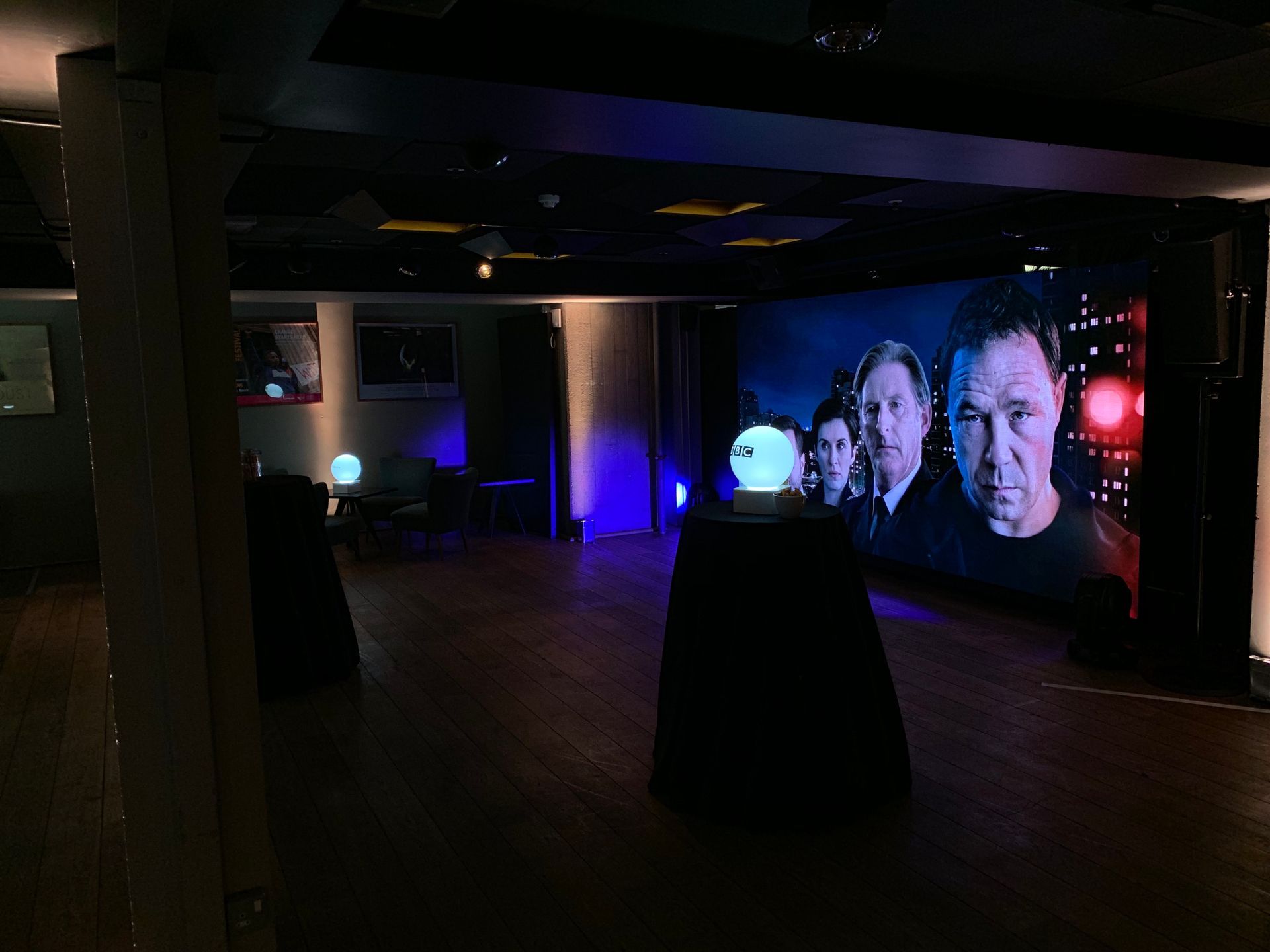 Alongside the additional AV for the Cinema room we provide a 2mm LED Video Wall, custom Lighting & Audio with a custom Table Centre piece with the event logo.